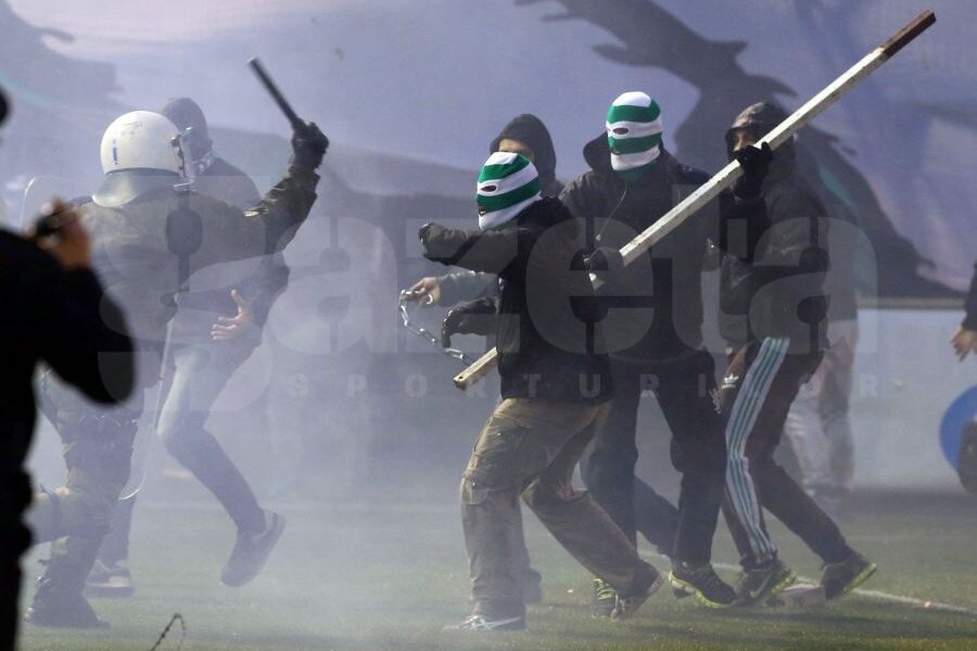 Duminică, derbyul Panathinaikos - Oly (2-1) a fost dominat de incidente, fanaticii verzilor hăituind jucătorii oaspeţilor şi atacînd poliţia cu lanţuri şi bare de fier