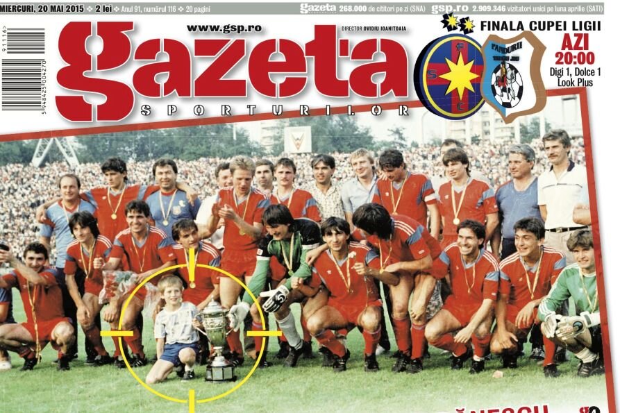 Pagina 1 de azi a Gazetei face avancronica finalei Cupei Ligii printr-o fotografie rară, din 1987, cînd Steaua a învins pe Dinamo (1-0, gol Boloni) în finala Cupei României.
