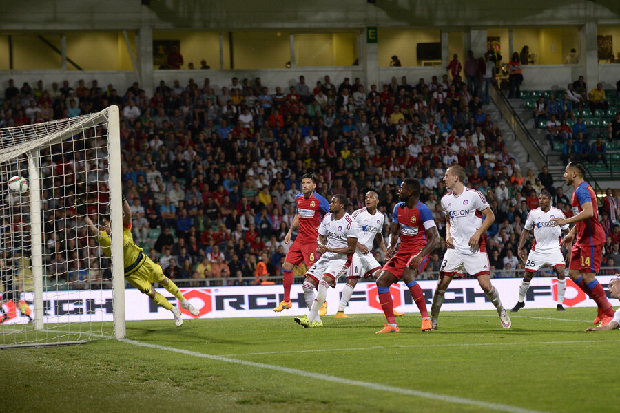 Stanciu aşază balonul, mulţimea aşteaptă centrarea. Stelistul trimite cu interiorul, dar nu plouat, pe lung, ci direct peste zid, lîngă prima bară. E gol! Execuţia curajoasă şi gafa portarului Semrinec colaborează pentru 0-1. Steaua stă bine!
