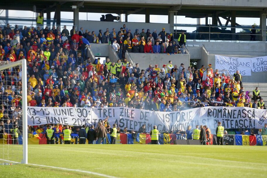 "13-15 iunie 1990: trei zile de istorie românească. 13 iunie 2015: Tot aşteptăm ca vinovaţii să plătească" a fost unul dintre bannerele afişate de fanii români.