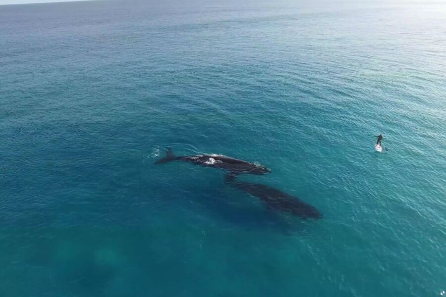Tînărul a fost însoțit în plimbarea lui de două balene frumoase, iar imaginile filmate printr-o dronă îți taie răsuflarea!
