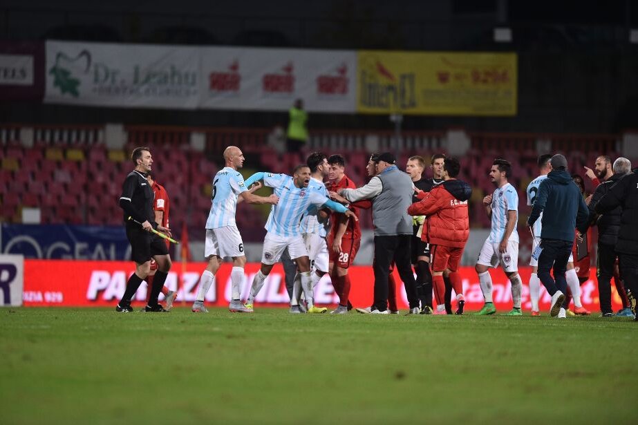 Un membru al staffului lui Dinamo i-a adresat injurii lui Cristiano Bergodi, antrenorul lui ASA. Italianul și jucătorii mureșeni au vrut să intre peste dinamoviști în vestiar, iar totul a degenerat în îmbrînceli și într-un meleu.