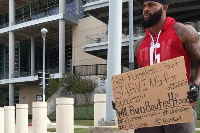 În urmă cu şase săptămîni, Anderson a postat o fotografie în care apare în faţa stadionului echipei Houston Texans, ţinînd un carton pe care scrie: "Nu sînt fără adăpost... Îmi este foame de succes. Alerg pentru mîncare".
