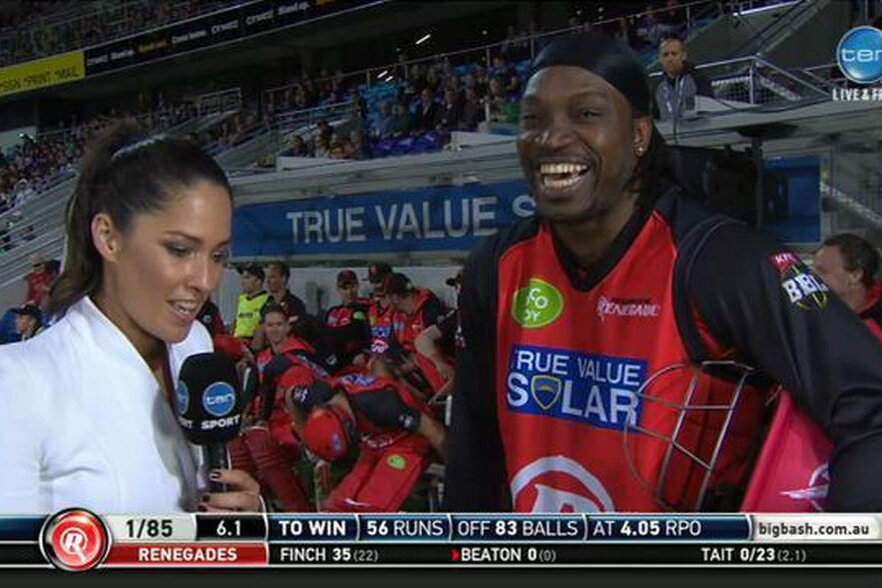 Chris Gayle, jucătorul celor de la Melbourne Renegades, a fost mai interesat de ziaristă decît de întrebările ei. ”Am venit la interviu pentru tine, tu ești motivul pentru care sînt aici... Am vrut să îți văd ochii pentru prima dată. Sper să cîștigăm meciul și să ieșim în oraș după. Nu te înroși, baby!”, a fost reacția acestuia în direct la Channel 10.
