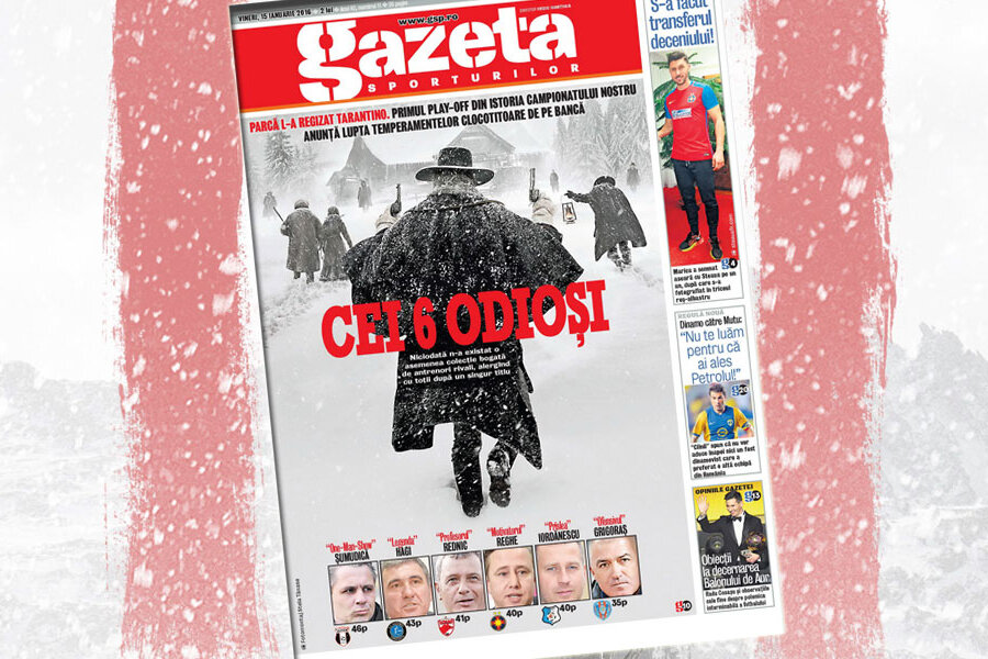 Gazeta Sporturilor a deschis azi cu o copertă specială, inspirată de afișul filmului "Cei 8 odioși" al lui Quentin Tarantino, pentru a ilustra lupta temperamentelor clocotitoare a antrenorilor care se vor înfrunta în primul play-off din istoria campionatului.