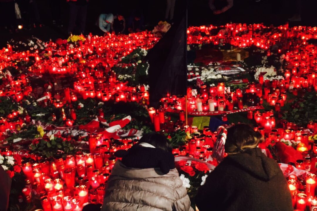 Fanii stau în continuare strânși la centrul terenului, iar în zona în care jucătorul s-a prăbușit aseară, în minutul 70 al partidei cu Viitorul, se află aprinse mii de candele.
