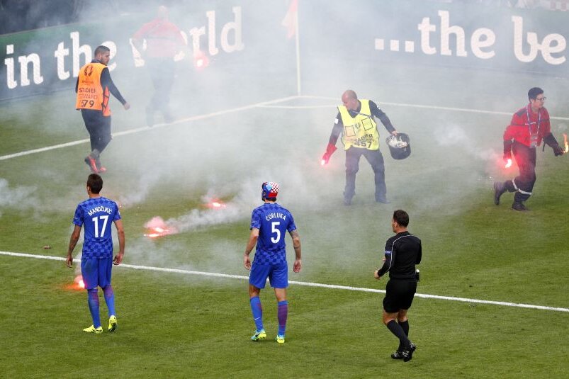 Nebunia s-a declanșat spre sfârșit, când mai erau doar 4 minute de joc. Dintr-o dată, colțul terenului s-a umplut de torțe, chiar în fața galeriei croate. Arbitrul adițional de pe acea parte, Anthony Taylor, s-a retras imediat. Peluza a fost separată de două rânduri de polițiști. Stewarzii au intrat pe gazon să ia torțele, dar isteria din spatele porții lui Cech nu s-a oprit. O petardă a aterizat exact la picioarele unui steward, care a fugit speriat. Degeaba au încercat jucătorii să-și liniștească fanii. N-au încetat. Meciul a fost întrerupt 5 minute în timp ce ultrașii croați se băteau între ei. Pumnii și picioarele zburau dintr-o parte în alta, fără ca poliția să intervină. Se pare că totul a fost premeditat de suporterii radicali aflați în conflict cu propria federație. Au vrut să declanșeze aceste incidente pentru ca forul de la Zagreb să fie pedepsit de UEFA. Dar acum plătește și echipa!