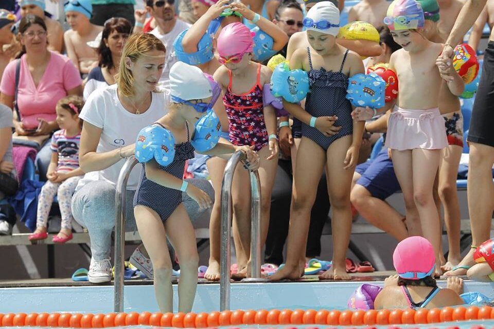 Copii și adulți vin acolo pentru a promova alături de campioana olimpică de la Atena pentru a promova sportul în apă.