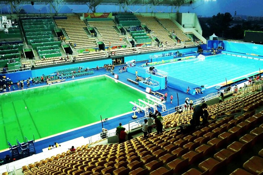 Luni, totul era OK. Marți, când sportivele de la sărituri sincron s-au aliniat pentru concurs, apa s-a transformat din albastru cristalin în verde închis. Ce s-a întâmplat?