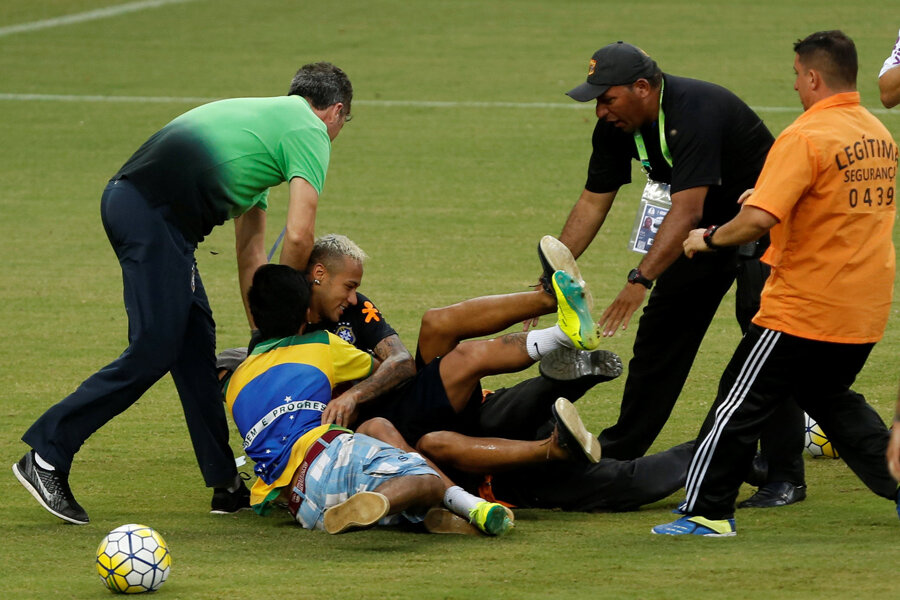 Încercând să scape de "vânători", unul dintre puștii amazonieni, îmbrăcat într-un tricou cu steagul verde și galben, a sprintat spre favoritul său, Neymar. Era înconjurat, nu mai avea decât o șansă. Să sară pe Neymar. Și asta a făcut! De ei s-a mai agățat un steward care voia să-l protejeze pe fotbalist și tot grupul s-a prăbușit în iarbă.