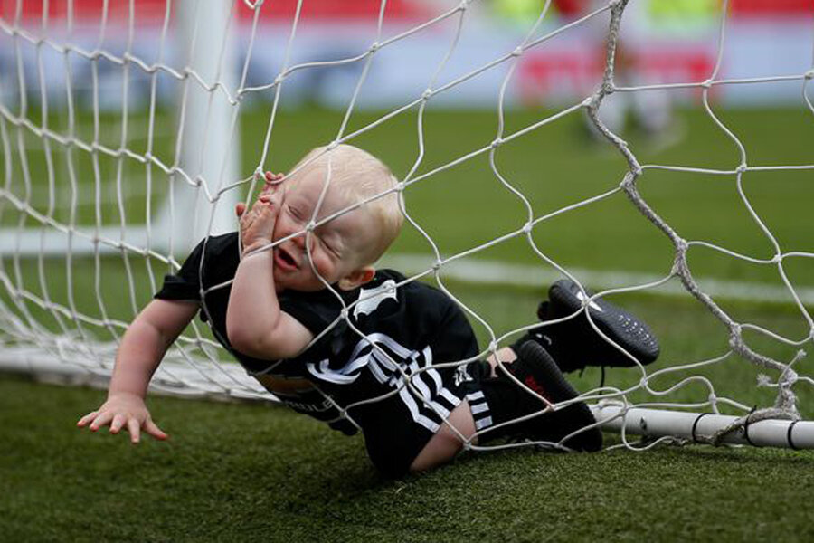 Doar că, urmărind o minge, s-a împiedicat și a căzut în plasă. Scena s-a petrecut duminică, la meciul cu Crystal Palace, unde puștiul a fost însoțit de soția atacantului lui Man. United, Colleen, și de frații săi, Kai, 7 ani, și Klay (4).