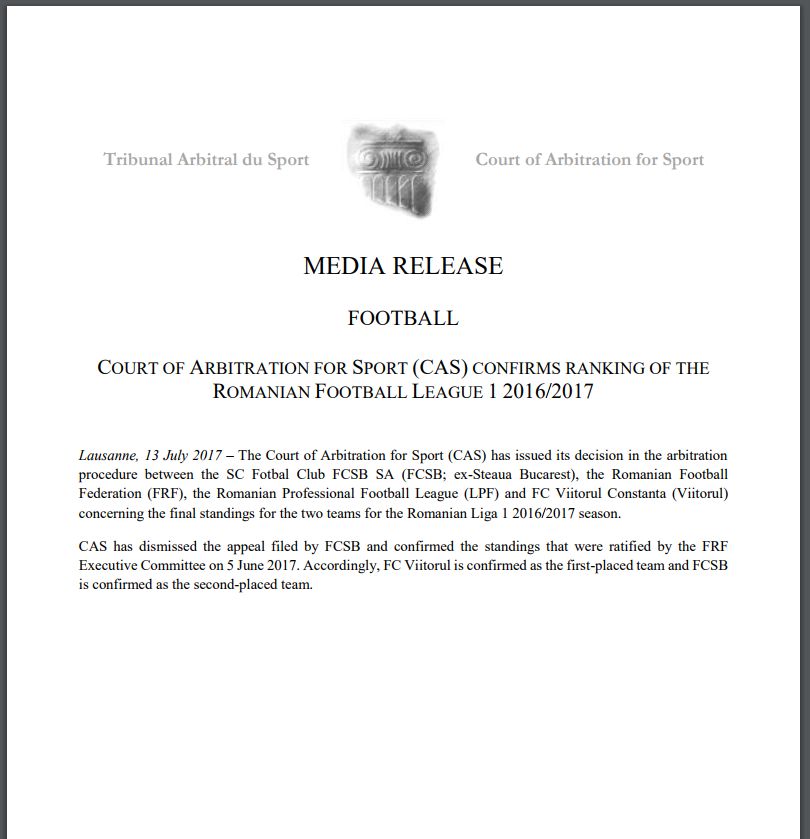 "TAS a respins apelul făcut de FCSB și a confirmat clasamentele omologate de Comitetul Executiv al FRF din data de 5 iunie 2017. Conform acestora, Viitorul este confirmată ca echipa clasată prima, iar FCSB este echipa clasată pe locul al doilea", se arată în document.