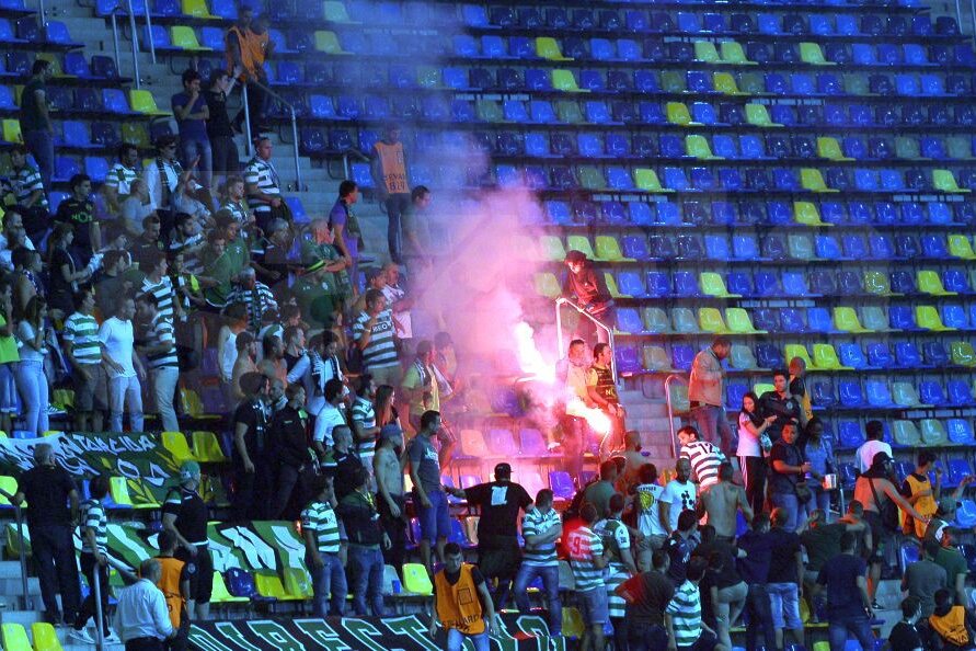 Galeria celor de la Sporting este formată din aproximativ 200 de ultrași, iar în startul meciului aceștia au creat probleme. Fanii au aruncat cu o torță către steliști, iar aceștia au aruncat-o înapoi.