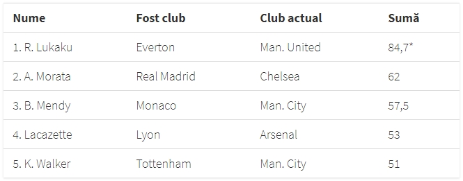 În 2017, au atins deja 1,27 miliarde, chiar dacă punctul maxim este departe de Pogba: 84,7 milioane, Romelu Lukaku, de la Everton la același club din Manchester.
