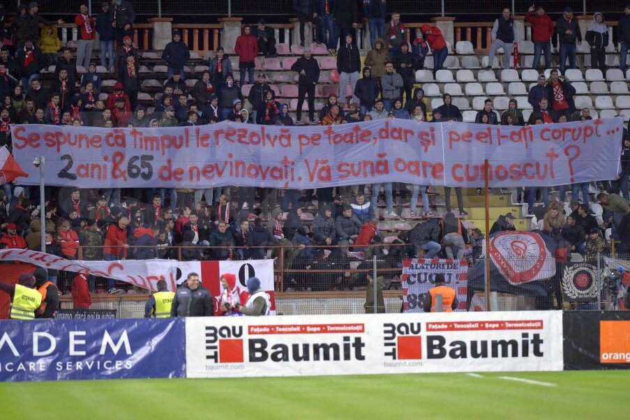 "Corupția înflorește într-un colectiv abuziv" și "Se spune că timpul le rezolvă pe toate, dar și pe el l-ați corupt... 2 ani&65 de nevinovați. Vă sună oare cunoscut?", au scris dinamoviștii pe bucățile de pânză la partida cu Viitorul, de pe Ștefan cel Mare.