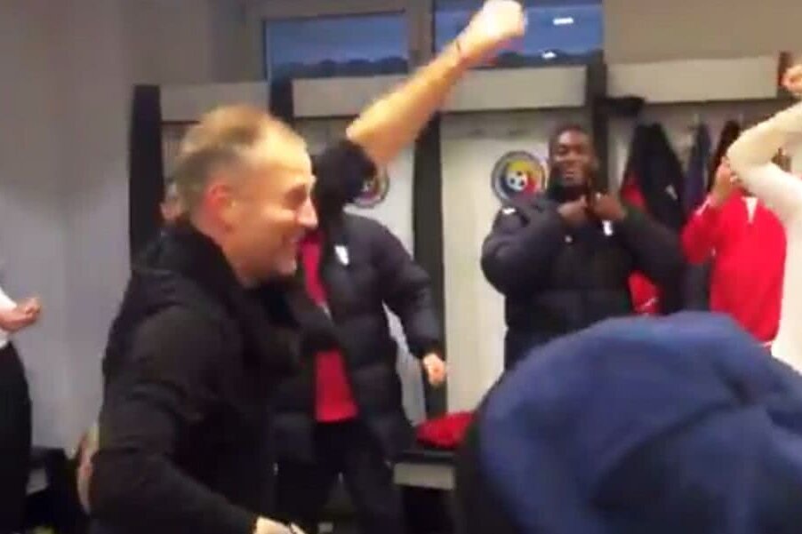 Aşa a fost întâmpinat Iordănescu junior în vestiar după succesul de duminică. Fostul fotbalist și antrenor stelist a intrat în jocul elevilor săi şi a salutat scandările triviale la adresa roş-albaştrilor.