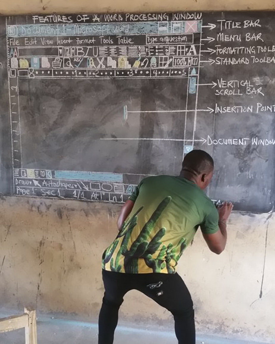 Școala la care predă nu dispune de calculatoare, însă profesorul a găsit metoda perfectă pentru ca elevii să se simtă ca și cum ar avea. Acesta desenează întotdeauna pe tablă programele pe care le predă, cu toate elementele pe care acestea le conțin. Desenele redau exact toate detaliile.