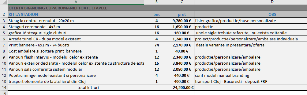 Cum explică FRF plata către Vitrina în valoare de 130.787 lei, adică 30.000 de euro pentru "branding Cupa României 16-imi montaj prin autocolant sală conferință": "Comanda de producție conține peste 140 de elemente de branding, care sunt produse o singură dată pentru desfășurarea tuturor meciurilor de Cupa României, la un standard de eveniment care să respecte atât noua identitate, cât și așteptările sponsorilor, partenerilor media și ale spectatorilor".