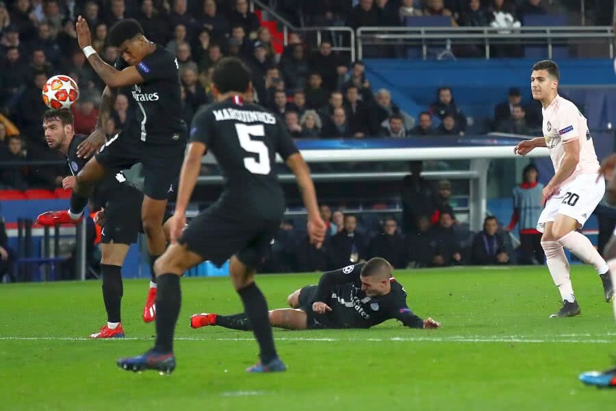 Dalot a șutat din afara careului, iar fundașul lui PSG s-a întors cu spatele și a blocat șutul cu brațul drept.