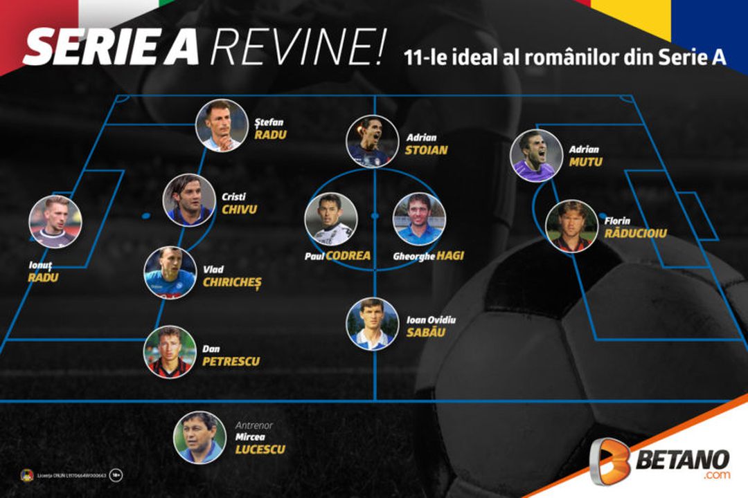 Considerat campionatul preferat al românilor care au dorit să facă pasul spre fotbalul mare după 1990, Serie A a fost gazda unora dintre cei mai importanți fotbaliști pe care i-a dat țara noastră. Un interesant exercițiu de imaginație adună laolaltă un prim „11” care, cu siguranță, s-ar putea bate pentru titlul de campioană. Cu Mircea Lucescu pe bancă, cu Andrei Radu în poartă, Cu Dan Petrescu și Ștefan Radu pe benzi, cu Hagi, Mutu și Răducioiu în atac. Vremuri frumoase, în care românii erau epicentrul unui campionat puternic!