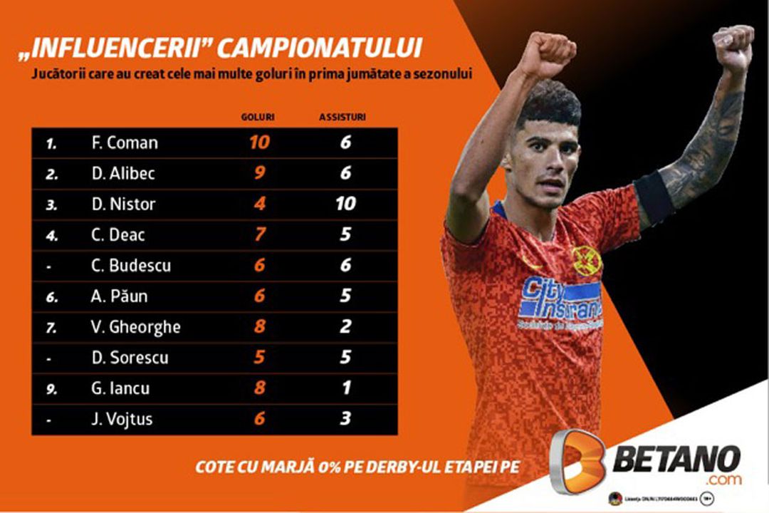 Dinspre Dan Nistor vine și cea mai mare cifră în dreptul paselor decisive - 10. În prima parte a sezonului, deși a jucat într-o echipă, Dinamo, cu rezultate modeste, mijlocașul central al Craiovei a reușit să se apropie ca influență de ceea ce înseamnă Kevin de Bruyne la Manchester City. Nistor a dictat ritmul la mijlocul terenului, a fost creierul și motorul echipei și s-a ales cu un total de 14 goluri la care a contribuit (patru reușite, pe lângă cele zece assist-uri). După un cantonament de adaptare, e așteptat să joace într-un trio cu Cicâldău și Mateiu la mijlocul terenuluim, iar Ivan, Mihăilă și Bărbuț se vor bucura, cu siguranță, de viziunea și exactitatea paselor lui Nistor.
