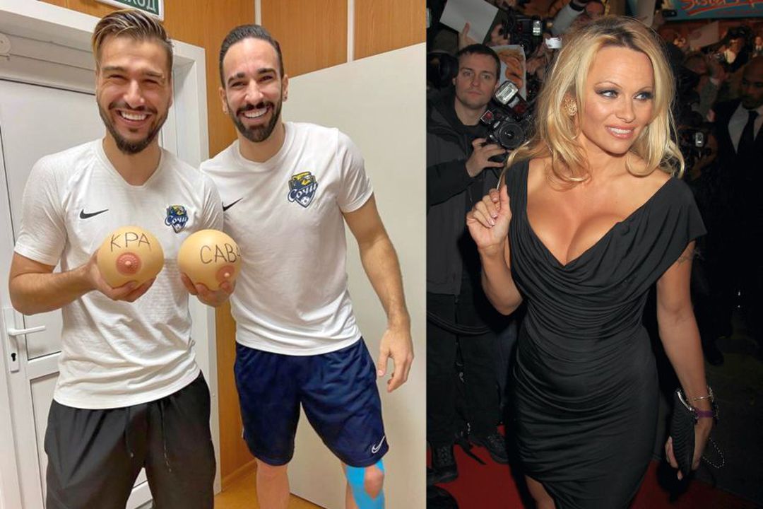 După conferința de presă în care a fost prezentat la FC Sochi, fundașul francez Adil Rami (foto, în dreapta) a pozat alături de fostul jucător rus Yevgeny Savin, comentator sportiv în prezent. Cei doi au fost surprinși zâmbind, în timp ce rusul ținea în mâini doi sâni din plastic.