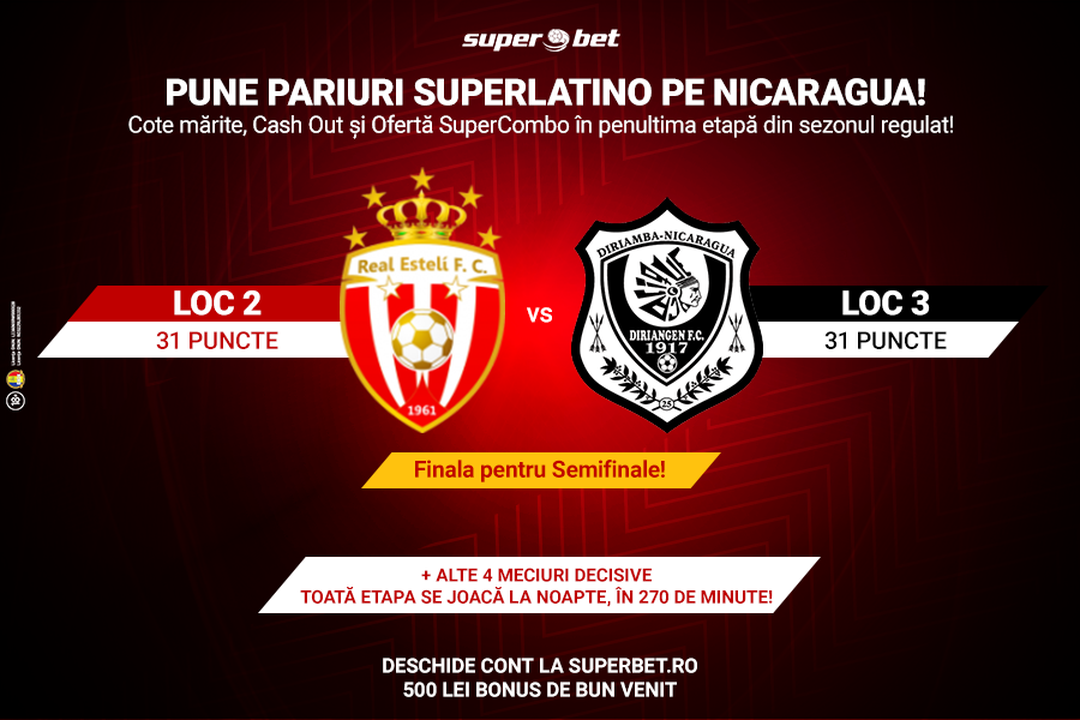 FINALA PENTRU SEMIFINALE! Marele duel al acestei etape! O confruntare între Campioana din Apertura, Esteli și cea mai titrată echipă din Nicaragua, Diriangen. Cele două își dispută locul 2, cel care te califică automat în semifinale și te scutește de un imprevizibil meci de baraj, în care forma de moment a unui adversar care a fost sub tine tot sezonul regulat te poate costa eliminarea din lupta pentru titlu. Serie de under 2.5 goluri pe meci (pariul 0-2 la Superbet.ro) în ultimele 4 “directe”. Diriangen n-a pierdut deloc în aceste 4 meciuri, reușind să câștige două dintre ele. În turul din Clausura a fost 2-0! Deci oaspeții au și opțiunea X-ului! Prinde acum cota mărită la Superbet.ro pentru egal în acest meci! Obține Bonusurile maxime în prima etapă a SuperPromoției de Paște!