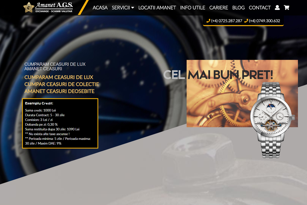 Oricât de bine ai sta din punct de vedere financiar, la un moment dat cu siguranță vei avea nevoie urgentă de o anumită sumă de bani. Cum poți face rost repede de bani? Apelând la serviciul oferit de către casa de amanet A.G.S. În cadrul acestei case de amanet poate fi amanetată o serie variată de produse, printre care ceasuri de lux, bijuterii sau obiecte de artă care au o valoare financiară foarte mare. În cazul în care produsul pe care dorești să îl amanetezi este un ceas de lux trebuie să știi că apelând la această casă de amanet vei beneficia de serviciul de evaluare gratuită a produsului. Acest serviciu este foarte important pentru că de acesta depinde valoarea sumei pe care o poți primi în schimbul amanetării obiectului. Evaluarea produsului este realizată de către un personal specializat, care are foarte mare experiență în acest domeniu de activitate și care poate aprecia foarte bine care este valoarea maximă pe care o poți primi în schimbul produsului amanetat.