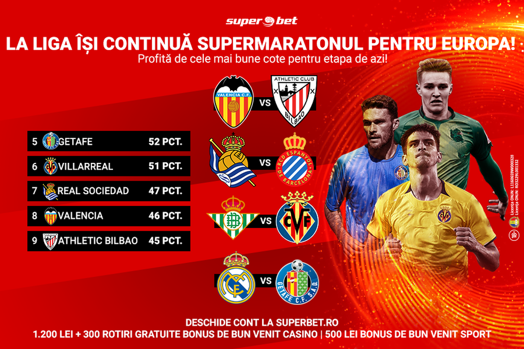 Se spune că poveștile frumoase se termină întodeauna repede, însă în fotbal lucrurile se prezintă altfel! La Liga îi oferă, de peste 90 de ani, strălucire fotbalului spaniol, fiind în prezent, cel mai apreciat campionat European. Sezon de sezon, suporterii și pariorii de pretutindeni le țin pumnii favoritelor și se bucură de cele mai spectaculoase derby-uri ale marilor echipe. Astăzi, La Liga se joacă la cele mai înalte cote, iar prinderea unui loc în Europa pare să fie un scop din ce în ce mai greu de atins pentru echipele fruntașe. Vezi care sunt formațiile care se luptă pentru un bilet către Europa și care sunt cele mai importante meciuri ale etapei de azi! Vrei să-ți începi cariera de parior? Înregistrează-te aici pe platforma Superbet și pune bilet pe favoritele tale!