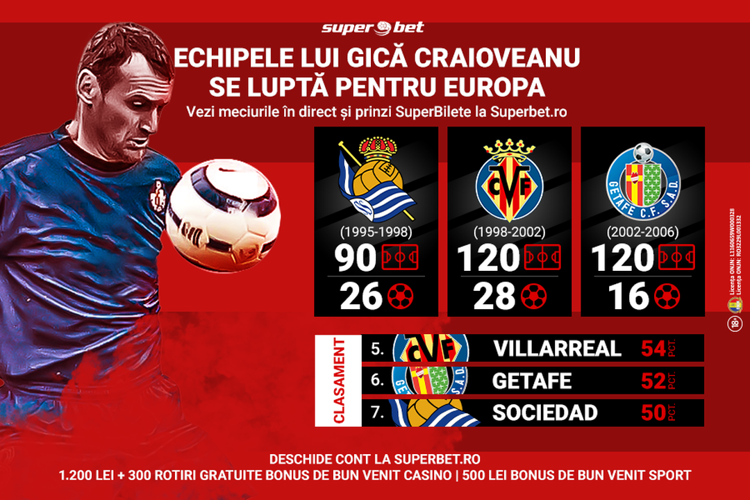 Ambasadorul Superbet n-a jucat în Europa cu Sociedad, Villarreal și Getafe; acum, toate trei pot ajunge acolo! Mai sunt cinci etape de disputat din La Liga, iar lupta la cupele europene este cel puțin la fel de pasionantă ca cea pentru titlu. Duelul la vârf este urmărit cu sufletul la gură și de Gică Craioveanu, ambasador Superbet, care, după multă vreme, vede cum toate cele trei foste echipe ale sale din Spania, Real Sociedad, Villarreal și Getafe sunt în luptă directă pentru un loc care duce în Europa.