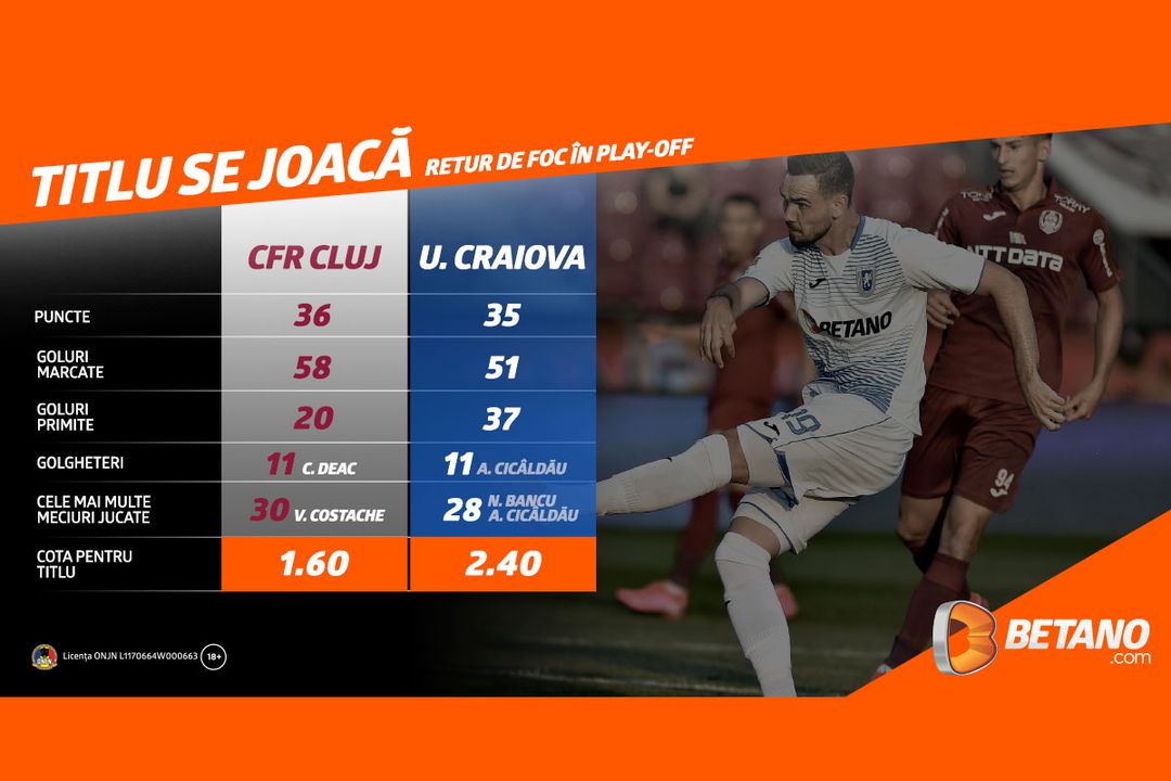CFR Cluj și Universitatea Craiova sunt despărțite de un singur punct cu cinci etape înainte de finalul sezonului, iar oltenii pot face istorie aducând titlul în Bănie după 29 de ani! Bătălia cotelor pe Betano este și ea strânsă, clujenii fiind favoriții principali la o cotă de 1.60, în timp ce Universitatea Craiova a micșorat distanța ajungând la o cotă de 2.40.