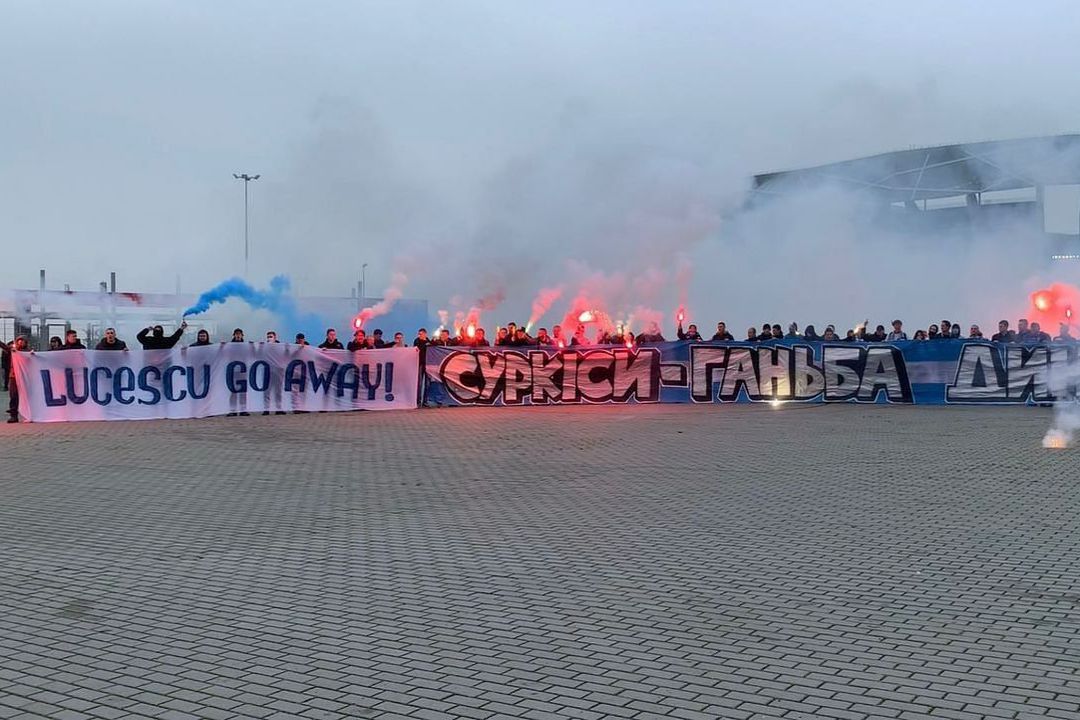 Rezultatele foarte bune înregistrate de Dinamo Kiev cu Mircea Lucescu la cârma echipei nu reușesc să îi îmbuneze pe suporteri. Ultrașii lui Dinamo au protestat împotriva antrenorului român lângă stadionul care a găzduit meciul de astăzi. Aceștia au afișat bannere cu mesajele „Lucescu, pleacă!” și „Frații Surkis sunt o rușine pentru Dinamo” și au scandat împotriva antrenorului român și conducerii clubului.