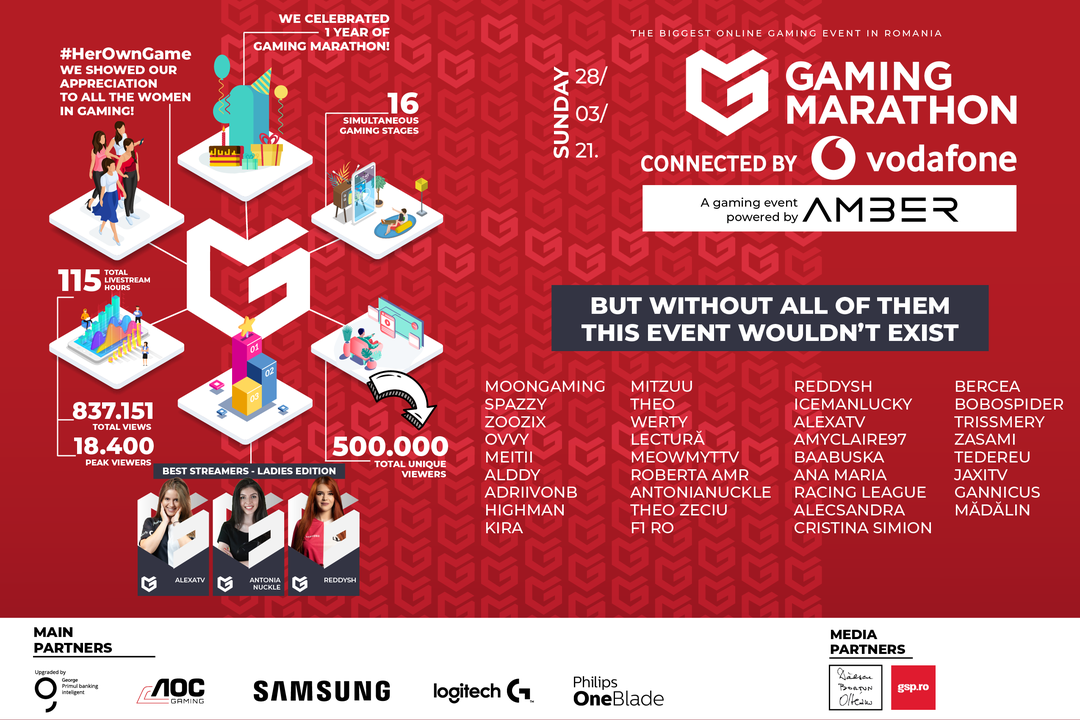 Gaming Marathon a fost connected by Vodafone și powered by Amber și susținut de George, AOC Gaming, Samsung, Logitech G și Philips OneBlade.