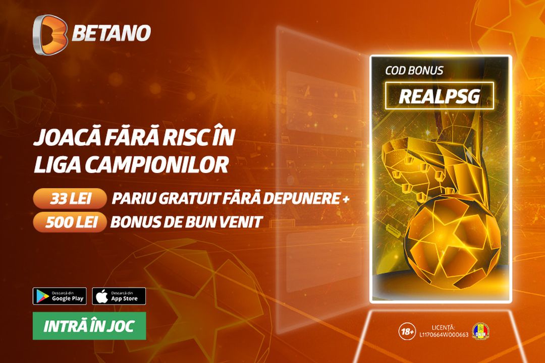 Atmosfera este una aparte așa că celebrăm Finala din Optimile Ligii cu o ofertă pentru toți utilizatorii noi! Te așteptăm să te înregistrezi acum pe Betano cu codul REALPSG, verifică-ți contul, iar noi îți oferim un Pariu Gratuit de 33 LEIfără depunere pentru meciul săptămânii în Europa!