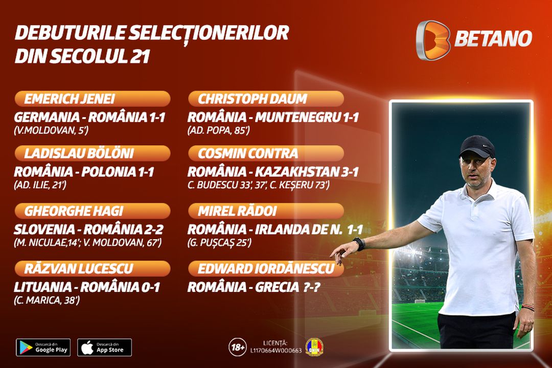 Edward Iordănescu va debuta ca selecționer pe Stadionul Ghencea, locul în care și-a început cariera de fotbalist și mai apoi pe cea de antrenor. România va întâlni reprezentativa Greciei de la 20:15, iar oferta de pe Betano aduce zeci de speciale, Cote Mărite și pariuri BetCombo pentru prima partidă cu noul selecționer.