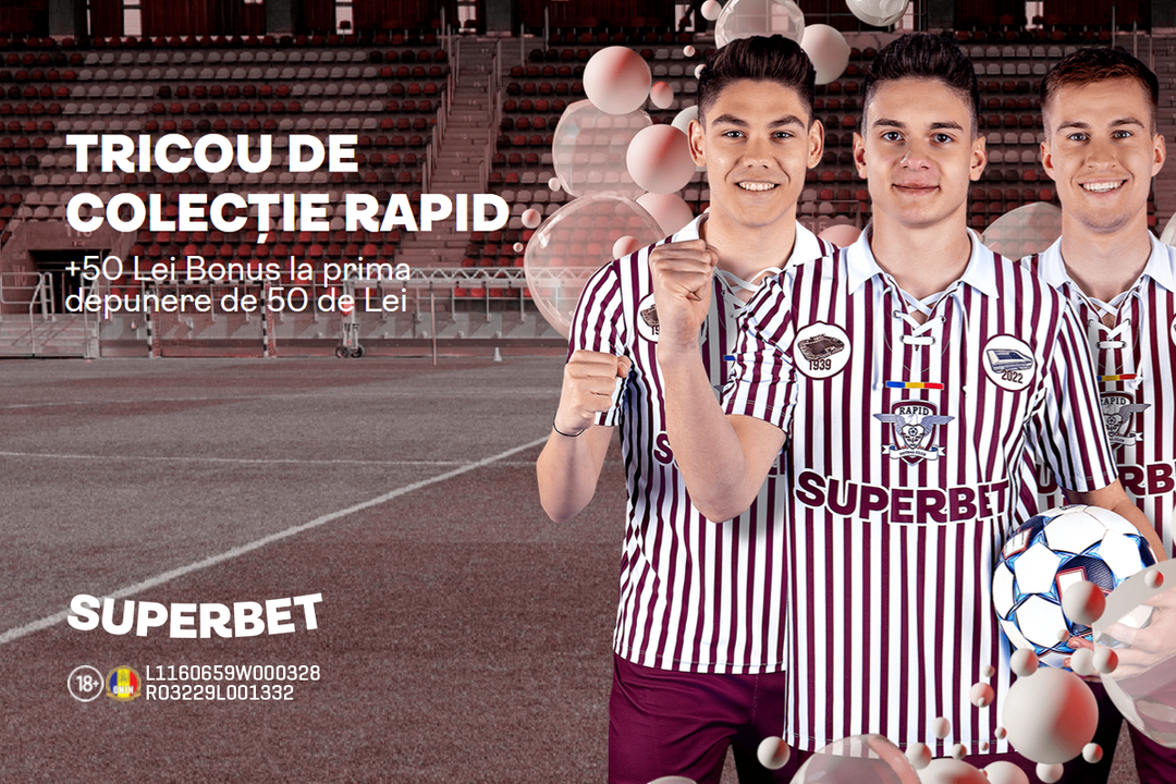 Tricoul Rapidului purtat de legendele clubului și actualii jucători pe 26 martie, la marea inaugurare a stadionului Rapid-Giulești, reprezintă o piesă de colecție după care tânjesc zeci de mii de SuperFani ai echipei conduse de Adrian Mutu. Va ajunge direct în muzeul clubului, dar poate fi al tău foarte, foarte simplu: dacă deschizi cont online pe Superbet.ro și îl alimentezi cu cel puțin 50 lei! Beneficiezi de această promoție de suflet dacă te înregistrezi aici.