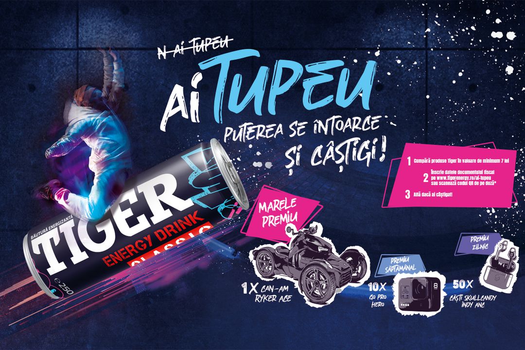 Înscrie-te acum în campania “Ai tupeu! Puterea se întoarce și câștigi!”, pe pagina dedicată din site-ul www.tigerenergy.ro. Tot ce ai de făcut este să achiziționezi până pe 11 septembrie oricare dintre produsele Tiger Energy Drink, în valoare de minimum 7 lei, să înscrii documentul fiscal pe pagina: www.tigerenergy.ro/ai-tupeu/, prin completarea câmpurilor formularului online de participare (nume, prenume, număr de telefon mobil, data, valoarea și numărul documentului fiscal). Nu uita să păstrezi documentul fiscal pentru validare! Pentru a fi mai ușor, scanează cu telefonul/tableta codul QR de pe doza promoțională Tiger Classic 250 ml și accesează link-ul www.tigerenergy.ro/ai-tupeu/.