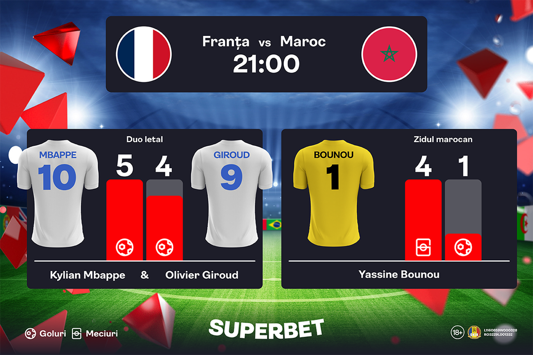 Primul bilet pentru finală s-a dat, a rămas unul singur. Iar contrastul dintre cele două combatante nu putea fi mai mare. Franţa este una dintre cele mai titrate echipe naţionale din istoria fotbalului, în timp ce selecţionata Marocului trăieşte în premieră un succes atât de mare. 21:00 este ora care va decide a doua finalistă a SuperMondialului din Qatar, iar Superbet este locul în care experienţele de la SuperMondial se trăiesc la intensitate maximă!