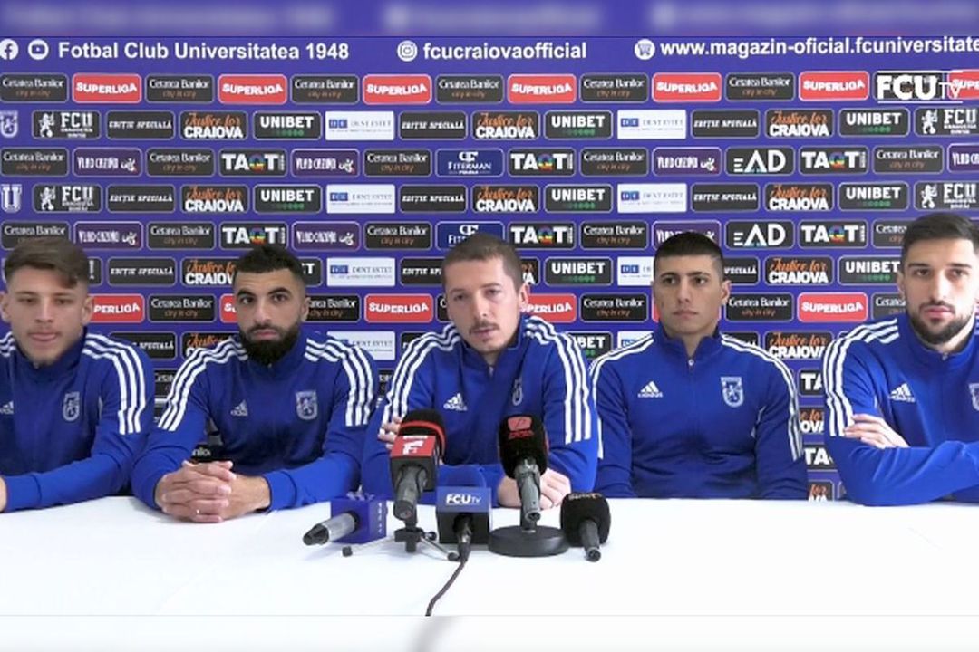 Mijlocașul Dragoș Albu, portarul Ionuț Gurău și mijlocașii Bahassa, Vlad Achim și Juan Bauza au participat astăzi la conferința de presă organizată de FCU Craiova înainte de rejudecarea cazului suspendării meciului cu Sepsi OSK.