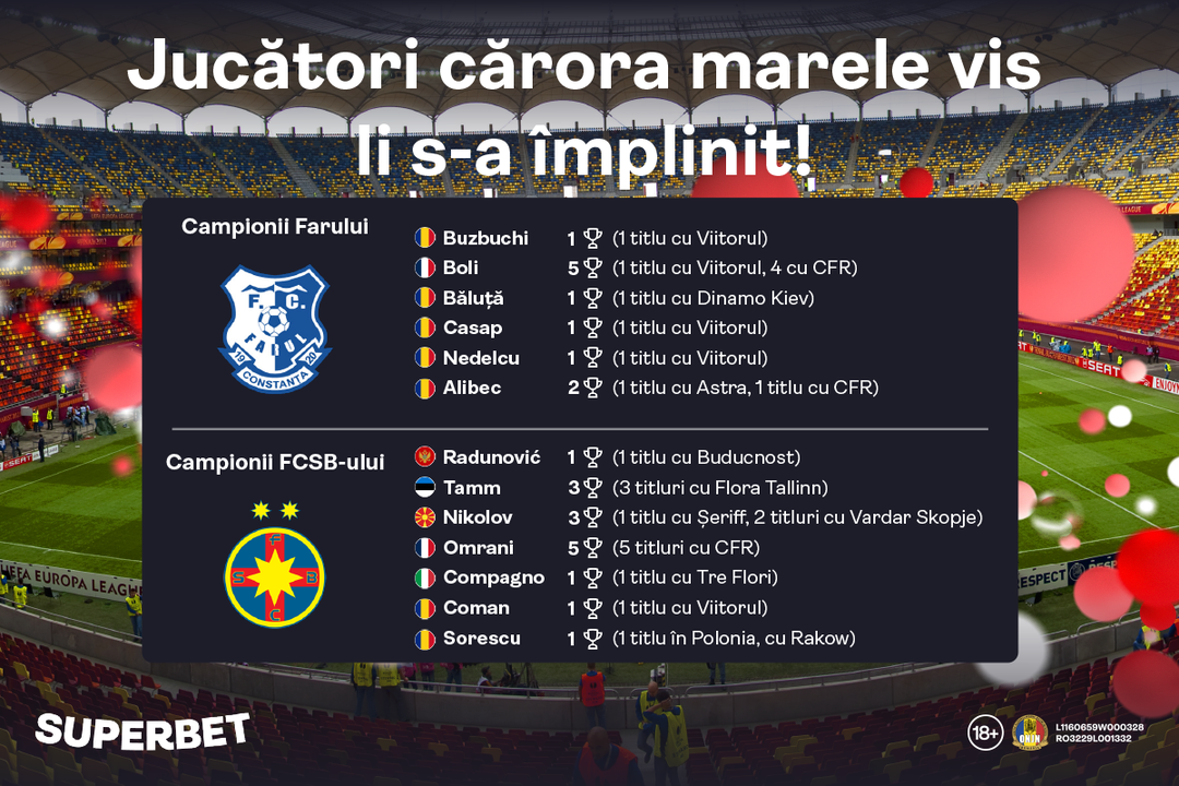 Cât contează experiența unor astfel de supermeciuri? Dar a câștigării titlului? Sunt antrenori care preferă să aibă jucători în vârstă în echipă tocmai pentru a menține echilibrul și a transmite ADN-ul de învingător, dar sunt și tehnicieni care merg pe entuziasm și ale tinereții valuri. Hagi îi are pe Buzbuchi, Nedelcu, Boli și Casap din gașca alături de care a câștigat primul titlu, iar Băluță și Alibec știu și ei cum e să ridici deasupra capului trofeul de campion. La FCSB, Coman (cu Viitorul) și Omrani (cinci titluri cu CFR) sunt singurii care s-au impus în România, dar un factor important ar putea fi reprezentat de pedigree-ul străinilor din lot: Radunovic a cucerit medalia în Muntenegru, cu Buducnost, Tamm e triplu campion al Estoniei cu Flora Tallinn, Boban Nikolov e campion în Republica Moldova (Șeriff Tiraspol) și Macedonia de Nord (Vardar Skopje), în timp ce Andrea Compagno are în CV titlul din San Marino, cu Tre Flori.