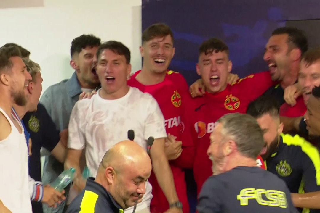 După 9 ani, FCSB e campioana României. Elias Charalambous, o parte importantă a succesului, a fost luat pe sus de jucători la final. Înainte de startul conferinței de presă a fost întrerupt de aceștia, iar campionii au declanșat fiesta.