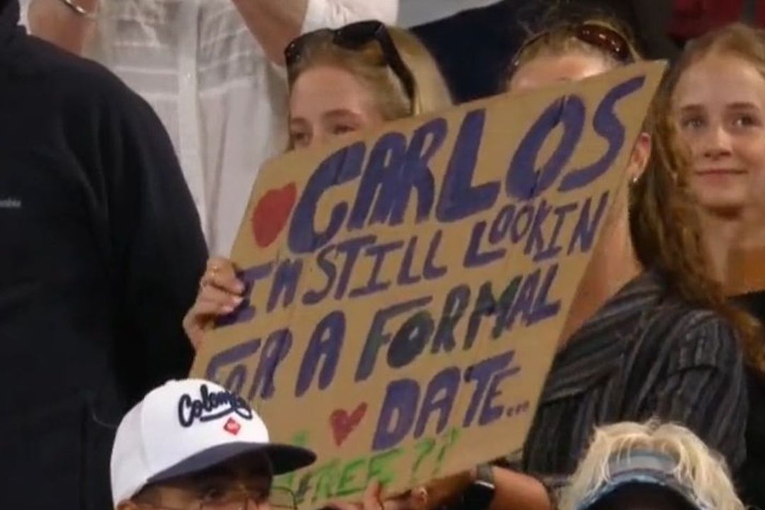 O fană din tribunele arenei Margaret Court a venit la meciul câștigat de Carlos Alcaraz (21 de ani, 3 ATP) cu o pancartă pe care era scrisă o cerere adresată ibericului de a ieși la o întâlnire cu ea.