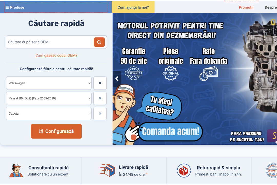 Schimbarile vizibile sunt evidente imediat ce accesezi magazinul nostru online. Am optimizat designul si am simplificat navigarea, astfel incat fiecare utilizator, indiferent de nivelul sau de familiarizare cu tehnologia, sa poata gasi rapid piesa dorita. Interfata a fost reorganizata pentru a pune accent pe accesibilitate si usurinta in utilizare. Acum, este mult mai simplu sa navighezi prin categoriile de produse si sa ajungi direct la piesele de care ai nevoie.