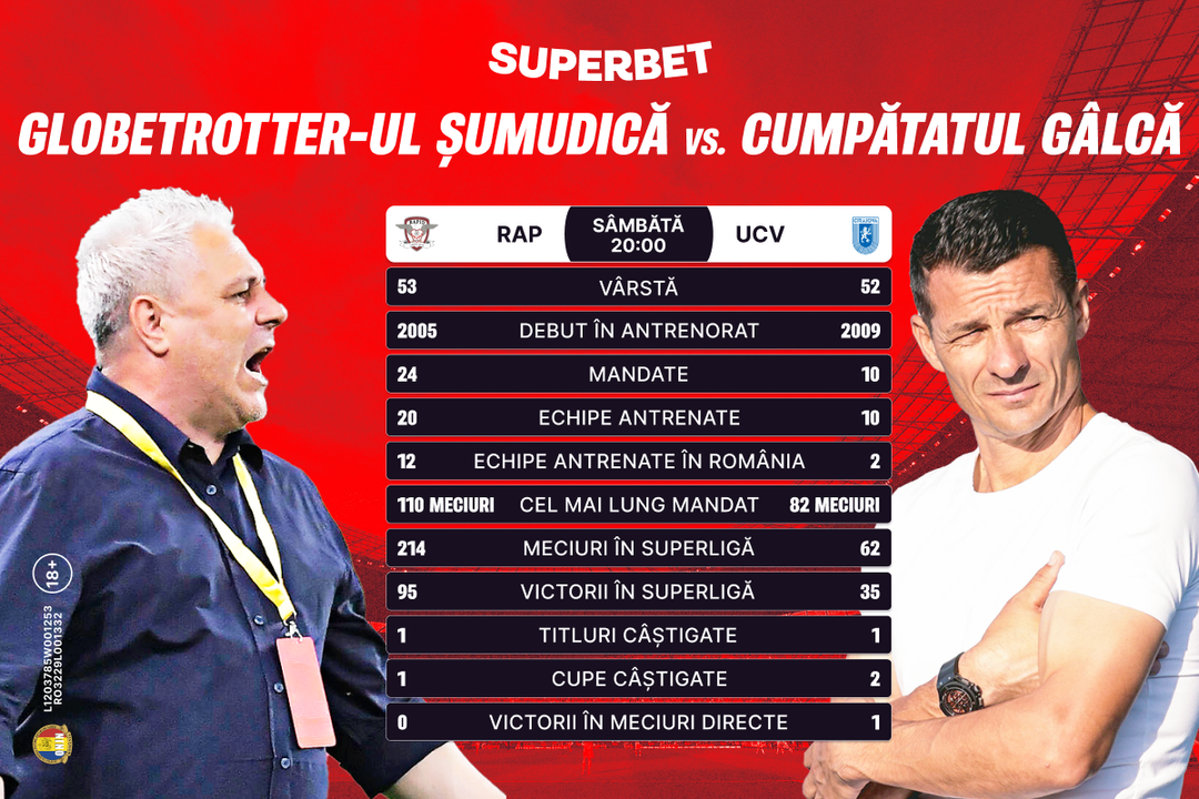Sâmbătă, de la ora 20:00, pe Superbet Arena-Giulești, fanii SuperLigii vor asista la unul dintre cele mai fierbinți derby-uri ale fotbalului românesc: un Rapid - Univ. Craiova în care miza e play-off-ul și care îi va avea pe cele două bănci tehnice pe Marius Șumudică (53 de ani) și Constantin Gâlcă (52 de ani).