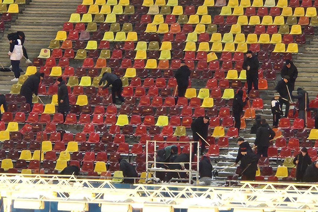 În jurul orei 18:15, Peluza Nord a celor de la FCSB, condusă de liderul Gheorghe Mustață, și-a făcut prezența la Arena Națională pentru a finaliza deszăpezirea gazonului.