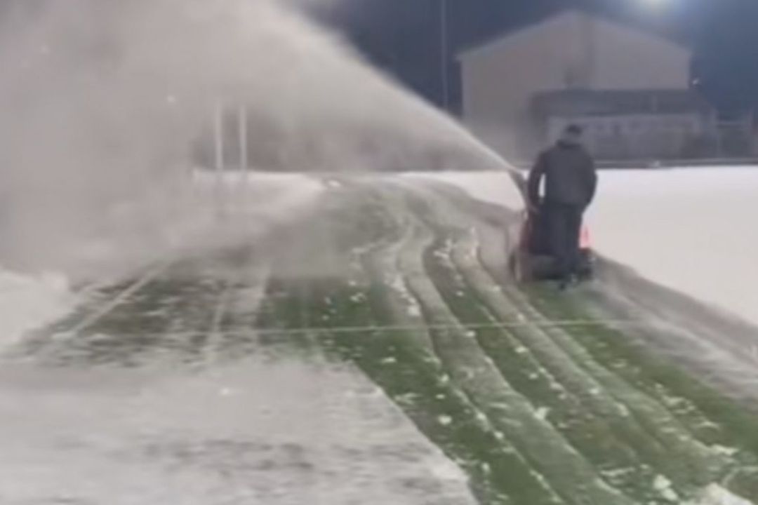 Voința Crevedia, echipă din Liga 4, a avut terenul acoperit complet cu zăpadă, însă cei care îngrijesc gazonul au deszăpezit printr-o metodă profesionistă, cu o mașinărie specifică.