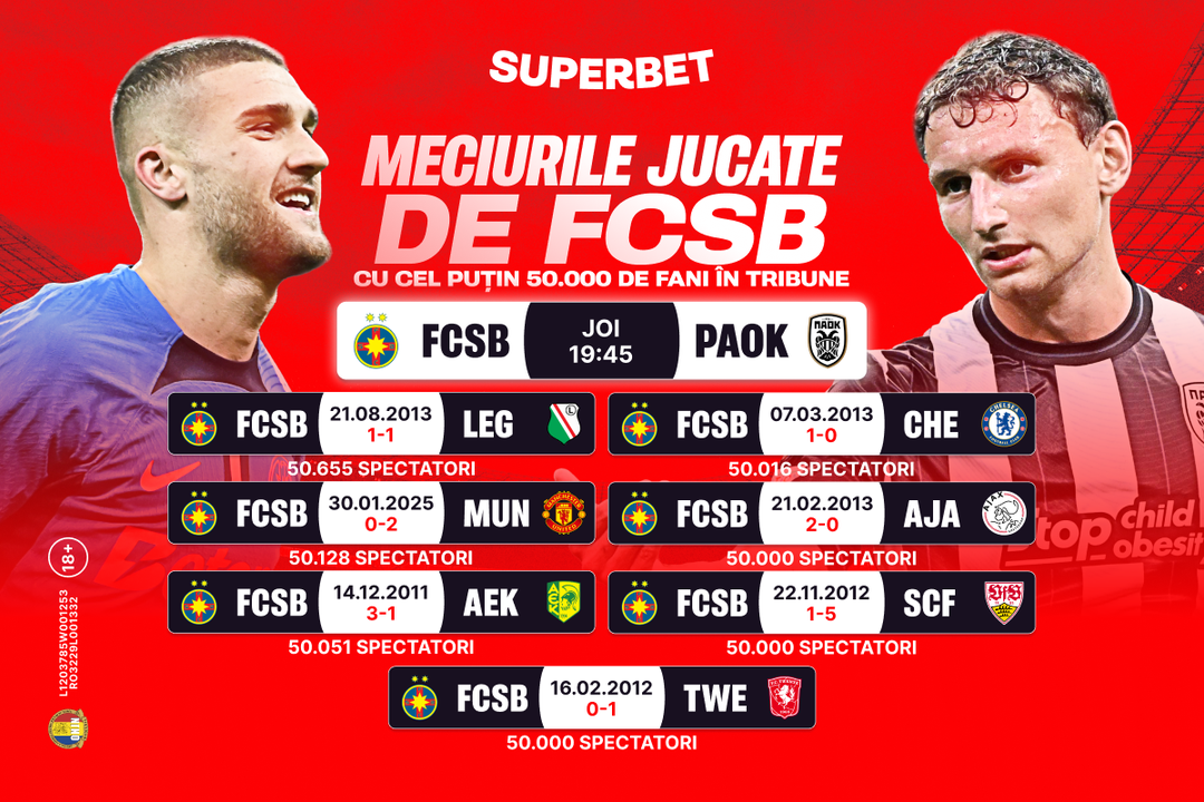 Ultima astfel de izbândă a avut loc la partida cu United, din finalul lui ianuarie, când 50.128 de spectatori au populat Arena Națională pentru a-și urmări favoriții contra unuia dintre cele mai mari cluburi din lume. Iar recordul la capitolul asistență într-un meci european e de 50.655 de spectatori la o partidă FCSB - Legia Varșovia 1-1, jucată în august 2013.