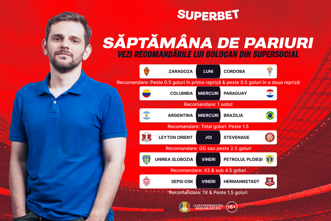Luni, un meci din La Liga 2 deschide biletul influencerului din SuperSocial. Zaragoza – Cordoba este partida aleasă, cu selecția Peste 0.5 goluri în prima repriză & peste 0.5 goluri în a doua repriză (cotă 1.88 la Superbet).