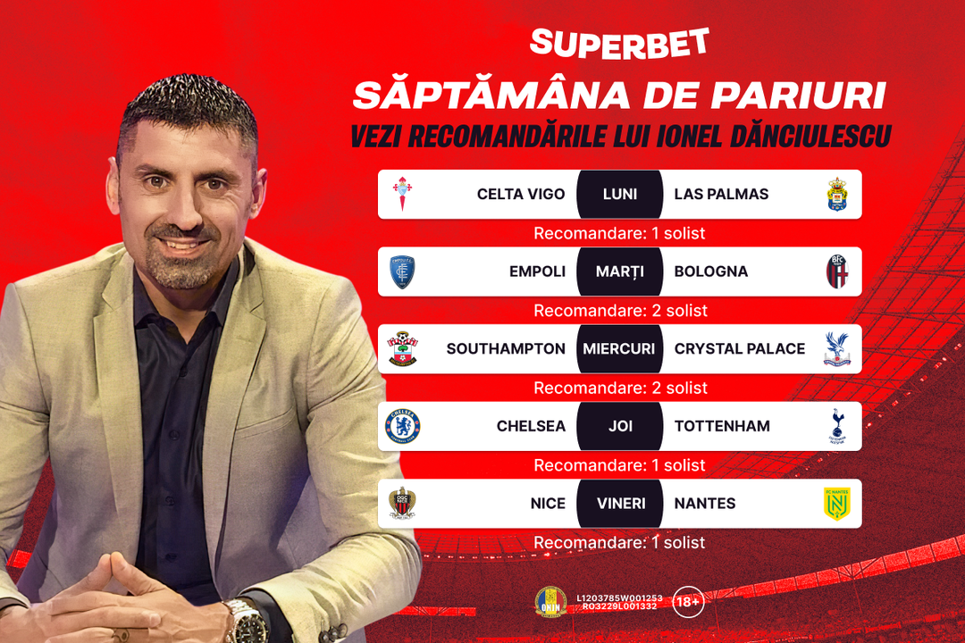 E luni, prin urmare e timpul să trecem în revistă cele mai tari meciuri de pus pe bilete. Ionel Dănciulescu este gazda acestei săptămâni și a creat, special pentru tine, un bilet în care a bifat meciurile și recomandările lui de pariuri.