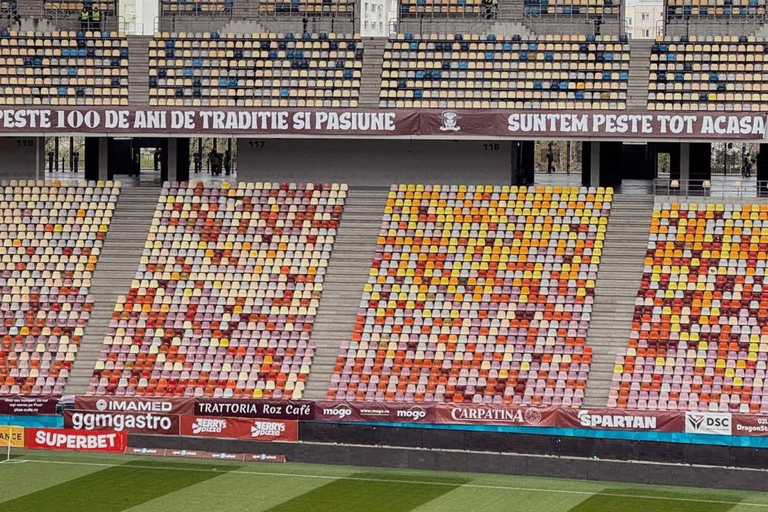 „Peste 100 de ani de tradiție și pasiune” și „Suntem peste tot acasă” sunt doar câteva dintre mesajele afișate pe fundal vișiniu în dreptul Tribunei 2.